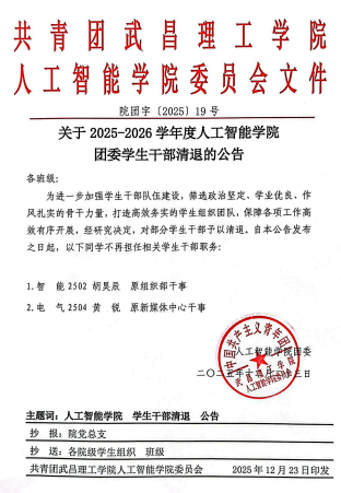 2025-2026学年度304永利集团团委学生干部清清退的公告