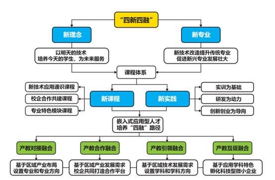 以培养卓越工程人才为目标,通过“四新四融”构建产教融合育人体系,以新理念引领,设置新专业,开设新课程,开展新实践,将应用型人才培养嵌入产教对接、产教合作、产教引领、产教互促等递进式“四融“路径。